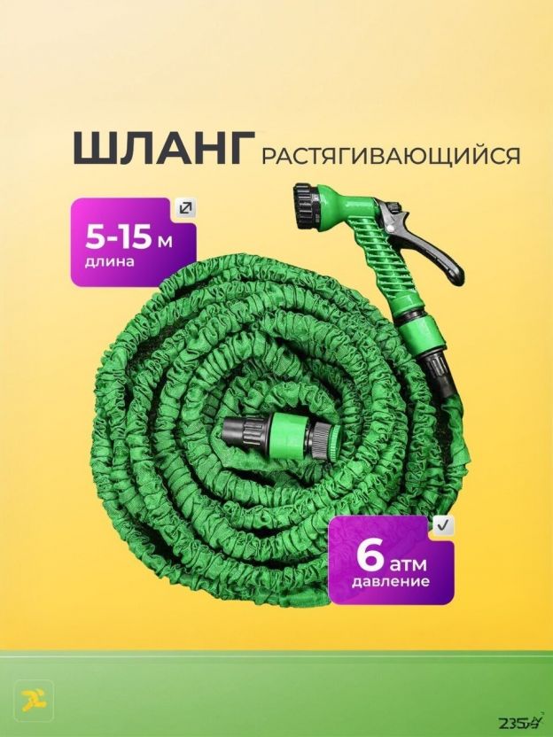- Растягивается до 3 раз – при подаче воды увеличивается с 5 м до 15 м, затем легко сжимается обратно.