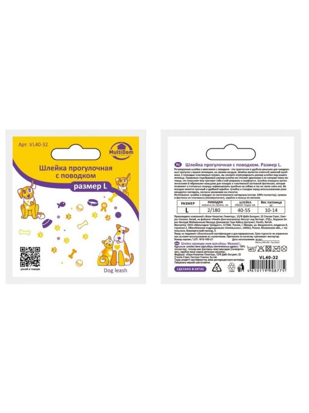 Шлейка прогулочная с поводком, размер L, MultiDom, в ассортименте