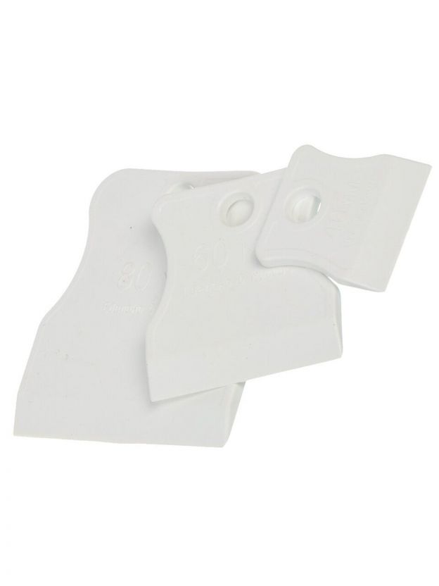 Рабочие поверхности из белой резины не оставляют следов и царапин, обеспечивая ровное нанесение материалов. Набор состоит из шпателей разного размера, что позволяет работать как на больших, так и на маленьких участках. Эргономичная форма инструментов обеспечивает удобное удержание в руке мастера, а в верхней части каждого шпателя предусмотрено отверстие для удобного подвесного хранения.
