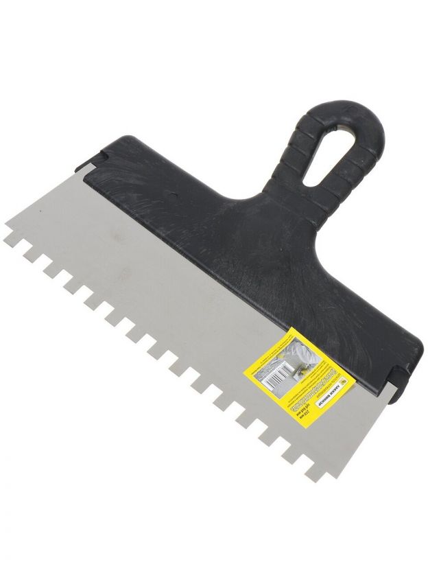Предназначен для нанесения и выравнивания клеевых составов при укладке кафельной плитки, керамогранита, облицовочного камня. Рукоятка изготовлена из пластика черного цвета, полотно из пружинной стали с антикоррозийным покрытием.