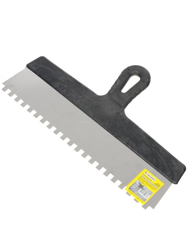 Предназначен для нанесения и выравнивания клеевых составов при укладке кафельной плитки, керамогранита, облицовочного камня. Рукоятка изготовлена из пластика черного цвета, полотно из пружинной стали с антикоррозийным покрытием.