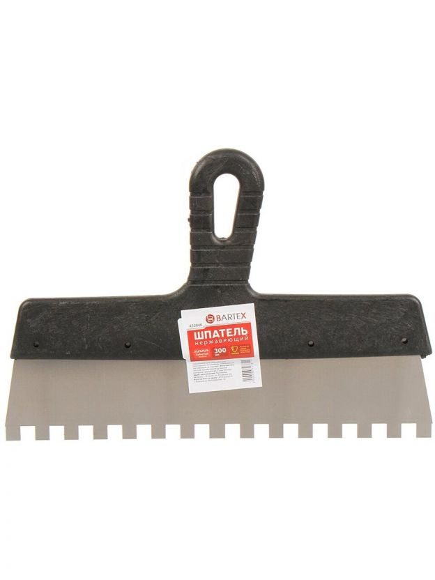 Шпатель нержавеющая сталь, 300 мм, зубчатый, зуб 10х10, рукоятка пластик, Bartex