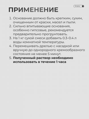 Основание должно быть крепким, сухим, очищенным от краски, масел и пыли. Сильно впитывающие основания, особенно гипсовые, рекомендуется предварительно прогрунтовать. На 1 кг сухой смеси добавить 0.3–0.4 л воды комнатной температуры. Перемешивать дрелью с насадкой или вручную до однородного кремообразного состояния не менее 5 минут. Полученный раствор необходимо использовать в течение 3 часов.