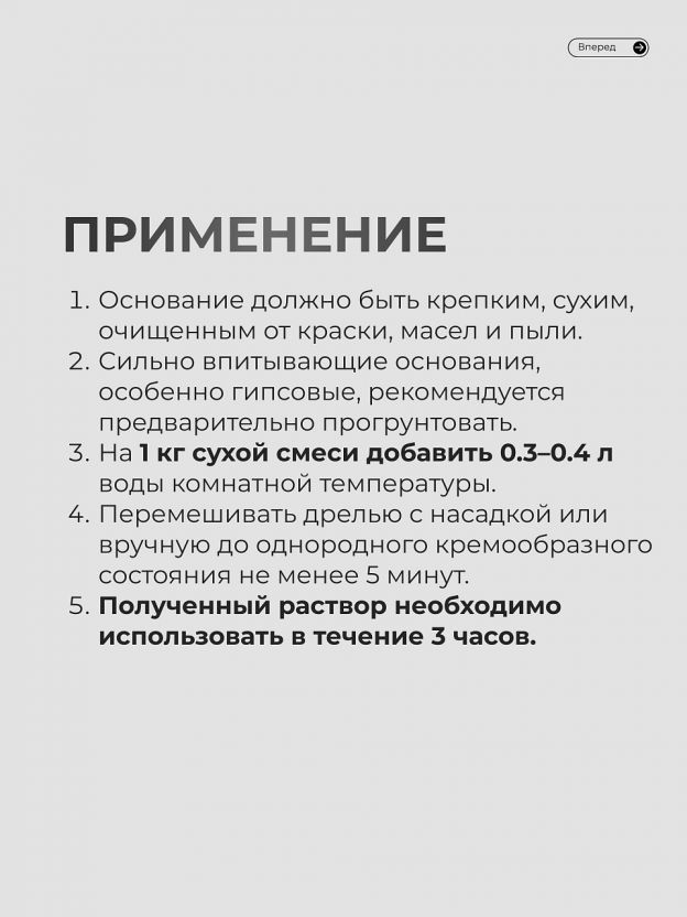 Основание должно быть крепким, сухим, очищенным от краски, масел и пыли. Сильно впитывающие основания, особенно гипсовые, рекомендуется предварительно прогрунтовать. На 1 кг сухой смеси добавить 0.3–0.4 л воды комнатной температуры. Перемешивать дрелью с насадкой или вручную до однородного кремообразного состояния не менее 5 минут. Полученный раствор необходимо использовать в течение 3 часов.