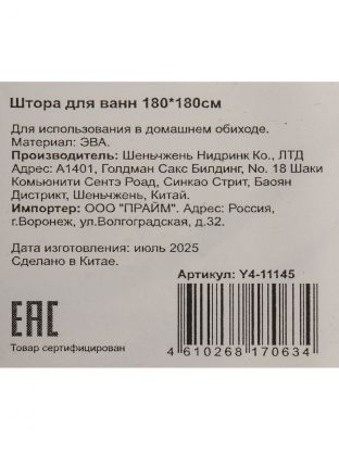 Размер 180х180 см универсален: штора подходит для большинства стандартных и угловых ванн, легко регулируется по высоте за счёт колец в комплекте.