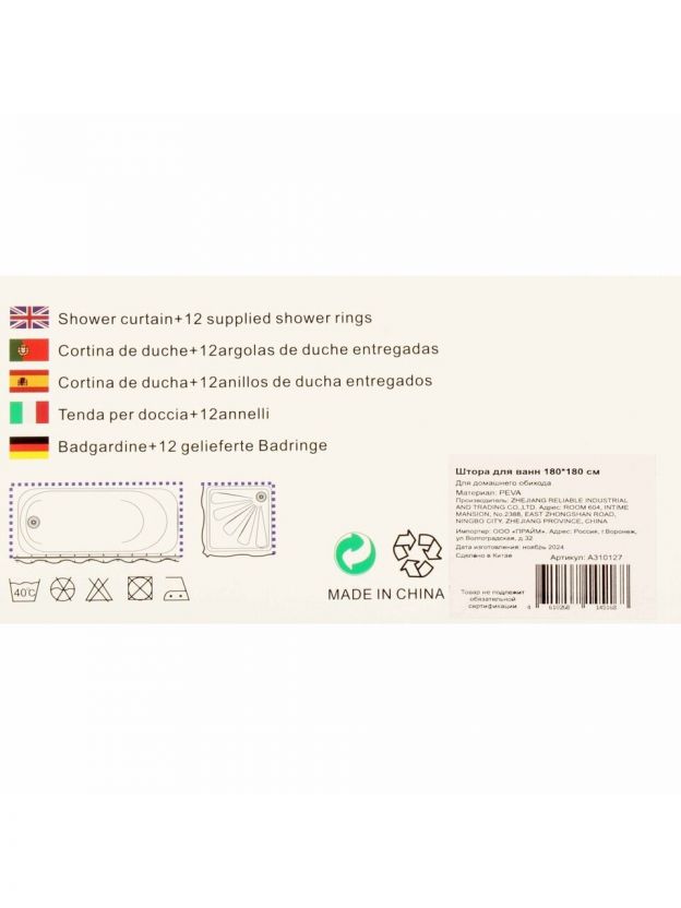 Штора для ванн 180х180 см из материала Peva с рисунком — стильное и практичное решение для оформления ванной комнаты. Белый цвет и современный дизайн освежают интерьер, а влагостойкий материал обеспечивает долгий срок службы и легкость ухода. Универсальный размер подходит для большинства стандартных ванн, сохраняя чистоту и комфорт в помещении.