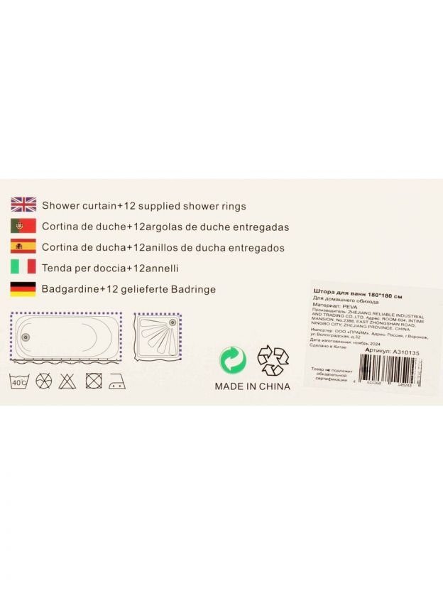 Штора для ванн 180х180 см с золотым принтом добавит стиль и элегантность в интерьер ванной комнаты. Материал Peva отличается прочностью и устойчивостью к влаге, что обеспечивает долгий срок службы. Универсальный размер подходит для стандартных ванн, а современный дизайн гармонично впишется в любой интерьер.