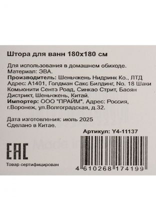 Размер шторы — 180х180 см. Она полностью закрывает стандартную ванну или душевую зону, защищая пол от воды. Материал — влагостойкий PEVA, не впитывает запахи и быстро сохнет.