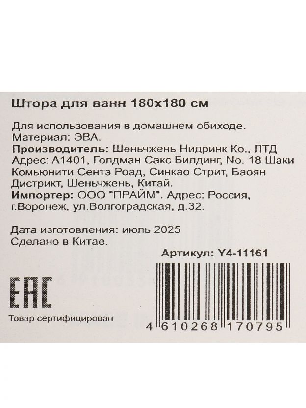 Штора имеет размер 180х180 см, что идеально подходит для большинства стандартных ванн и душевых кабин.