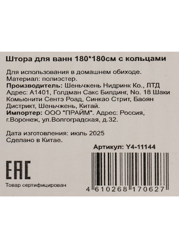 Штора для ванн 180х180 см из плотного полиэстера — стильное решение для защиты от брызг, долговечность и идеальный размер для любой ванной комнаты.