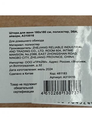 Штора для ванн 180х180 см, полиэстер, ЭВА, айвори, A310016