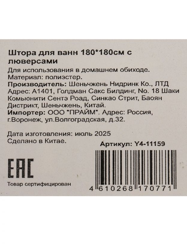 Размер — 180х180 см, подходит для стандартных ванн и душевых уголков. Материал — полиэстер, легко крепится на люверсы.
