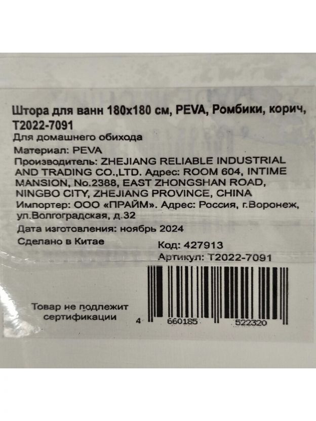 Штора для ванн 180х180 см, полиэстер, Ромбики, коричневая, T2022-7091