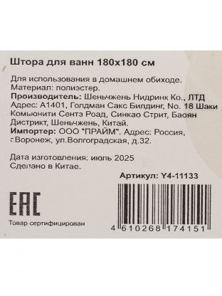 - Размер 180x180 см подходит для стандартных и просторных душевых, прочный полиэстер устойчив к влаге и плесени.
