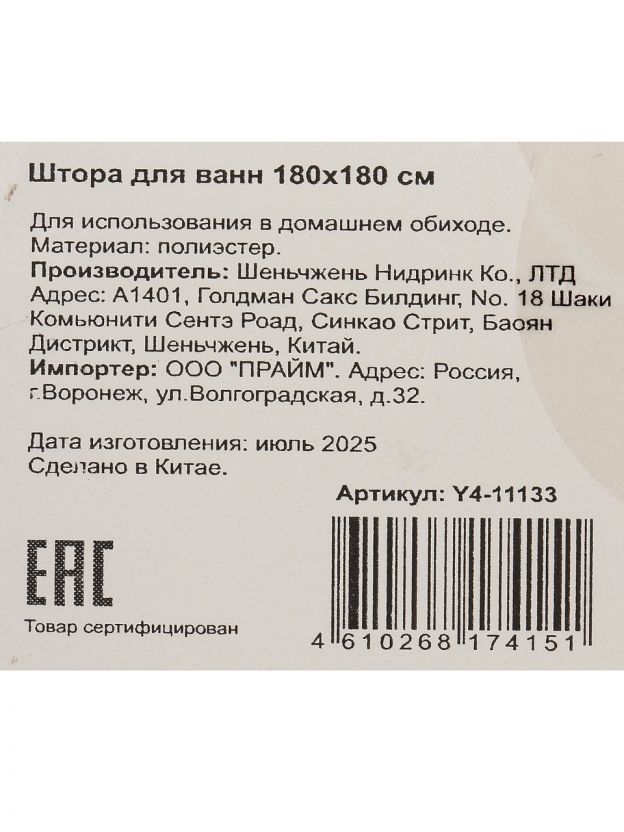 Размер шторы — 180х180 см. Это универсальный вариант, который подходит для большинства стандартных ванн и душевых кабин.