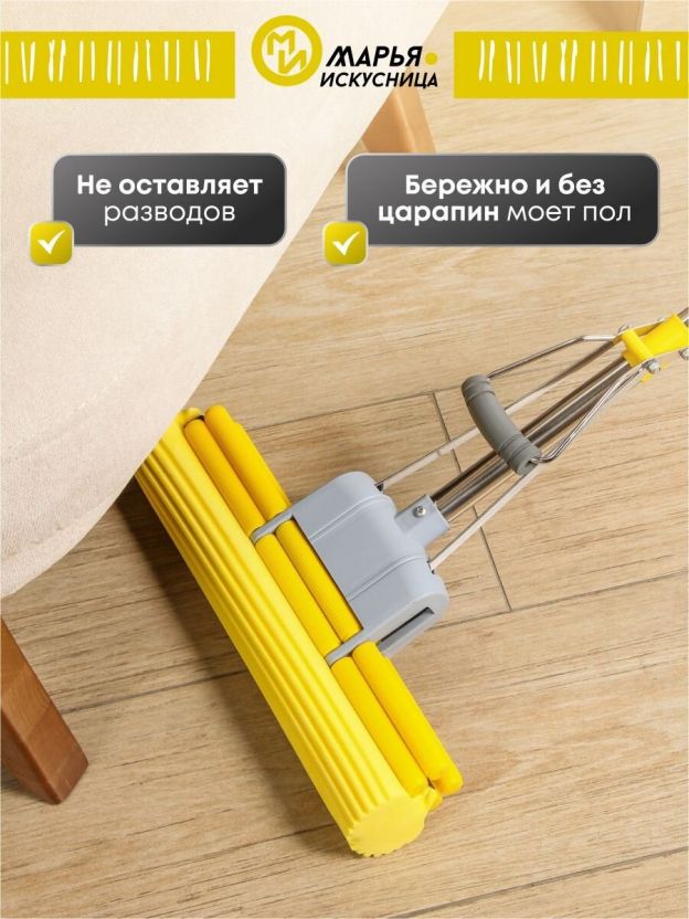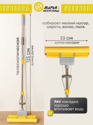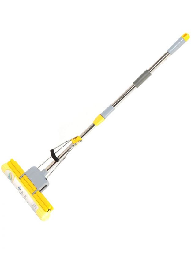 Швабра МОП губка, ПВА, 125х33 см, желтая, с двойным отжимом, телескопическая ручка, Марья Искусница, KD-14-P03