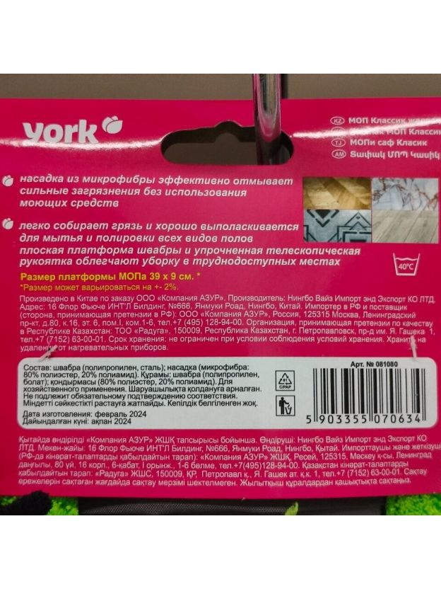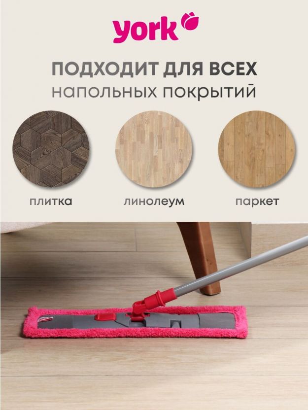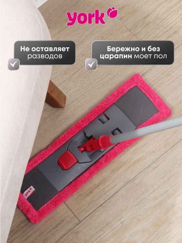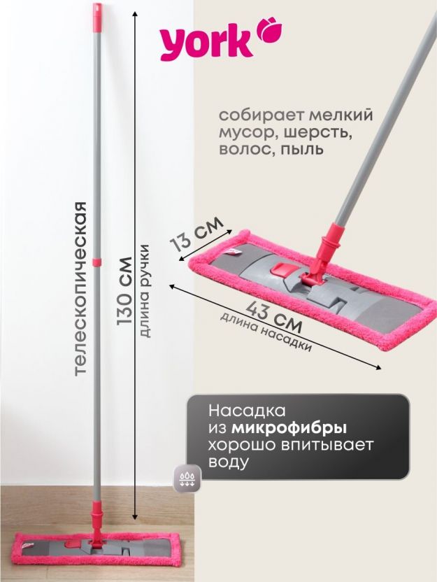 Швабра МОП плоская, 130 см, в ассортименте, телескопическая ручка, в ассортименте, York, Классик, 081080