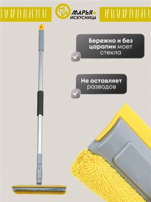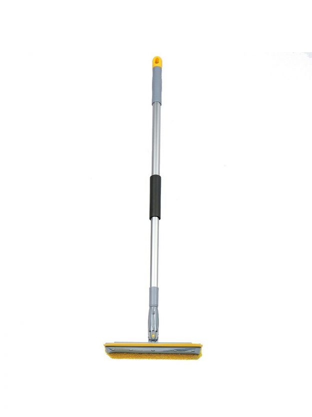 Швабра для мойки окон с телескопической ручкой. Имеет моющую часть и телескопическую ручку. Изделие состоит из поролоновой губки, ручки и резинового водосгона. Ручка будет особенно полезна, если оконный проём находится высоко.