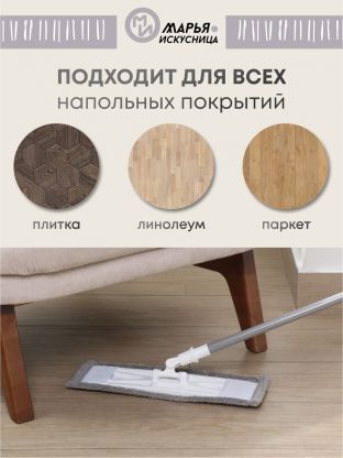 Швабра с насадкой из микрофибры подходит для влажной уборки и мытья полов из любых материалов, идеальна для ухода за натуральными напольными покрытиями: паркетная доска, пробковые полы, сизаль. Не оставляет разводов и ворсинок. Позволяет сократить время сухой и влажной уборки полов. Прекрасно справляется с уборкой в труднодоступных местах: под шкафами, диванами и т.п.