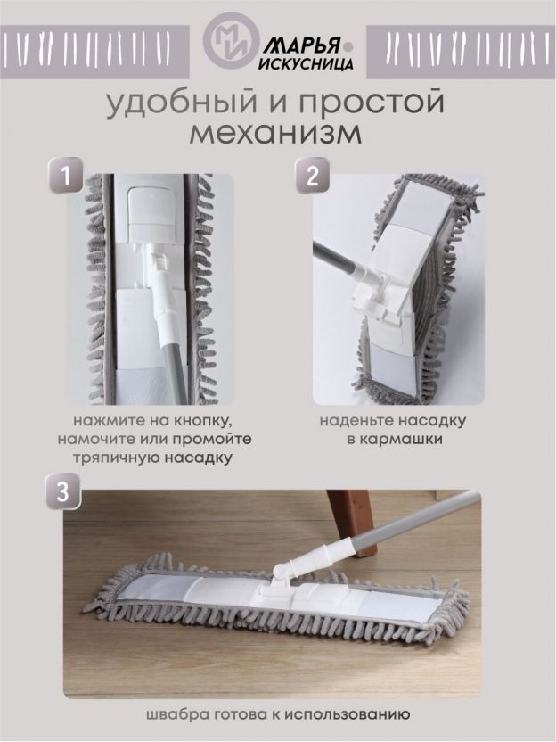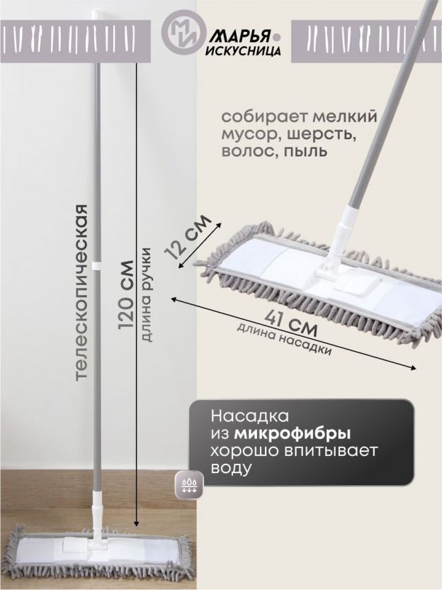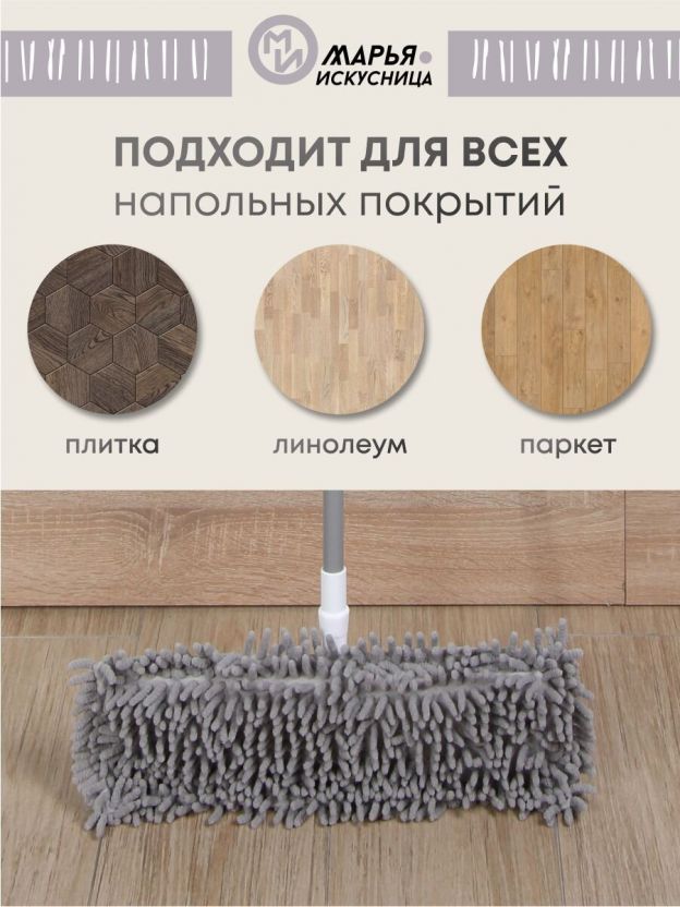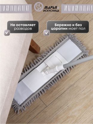 Швабра с насадкой из микрофибры подходит для влажной уборки и мытья полов из любых материалов, идеальна для ухода за натуральными напольными покрытиями: паркетная доска, пробковые полы, сизаль. Не оставляет разводов и ворсинок. Позволяет сократить время сухой и влажной уборки полов. Прекрасно справляется с уборкой в труднодоступных местах: под шкафами, диванами и т.п.