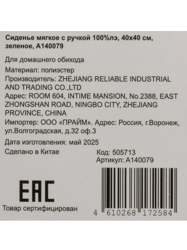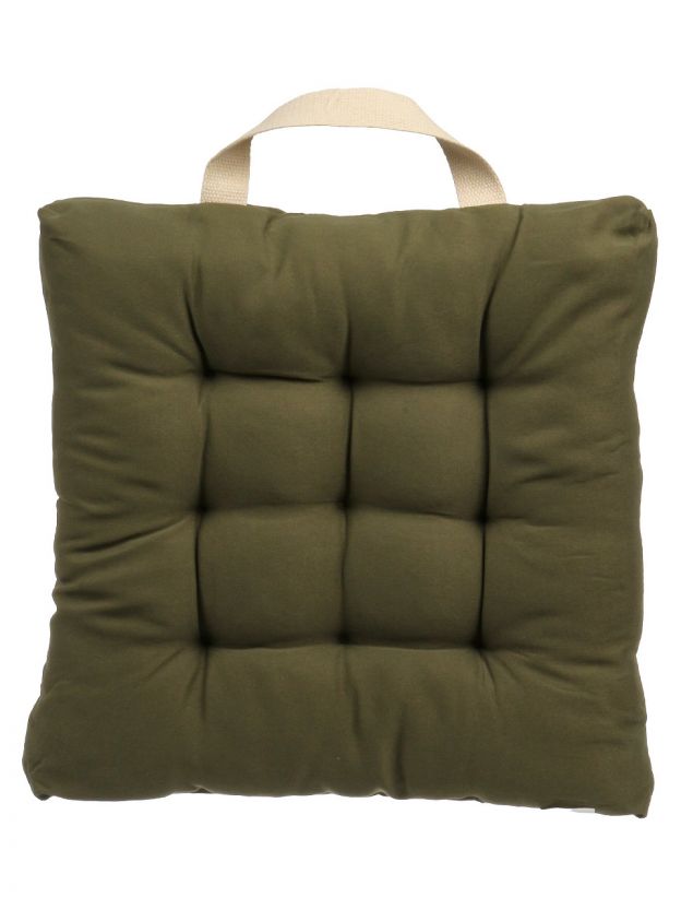 Сиденье мягкое с ручкой 100% полиэстер, 40х40 см, зеленое — комфорт для дома и дачи: удобно носить, легко чистить, снижает нагрузку на спину.