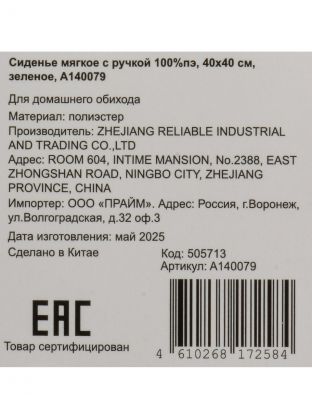 Сиденье мягкое 100% полиэстер, 40х40 см, зеленое, с ручкой, A140079