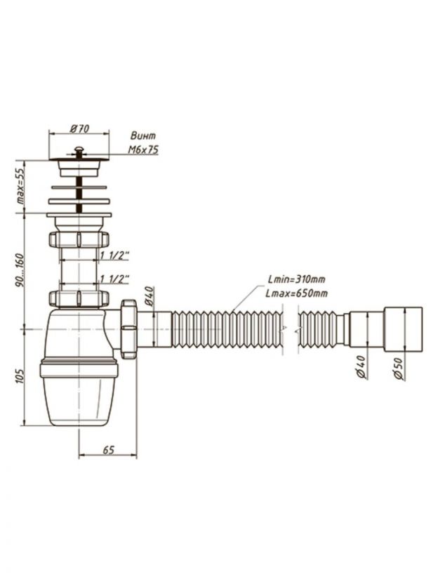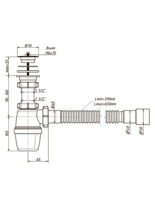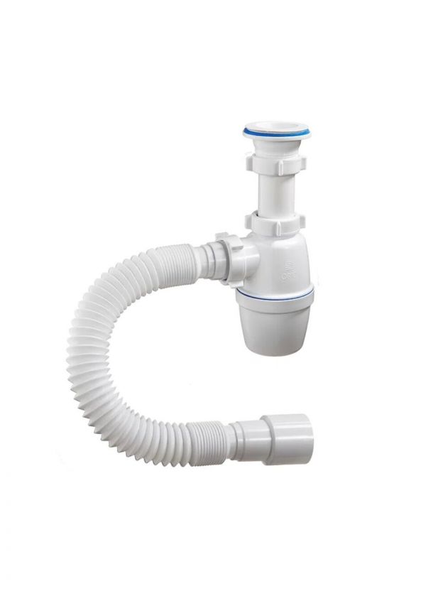 Сифон с большим корпусом и отстойником, выпуском с пластиковой чашкой и гибкой трубой для раковины или мойки.