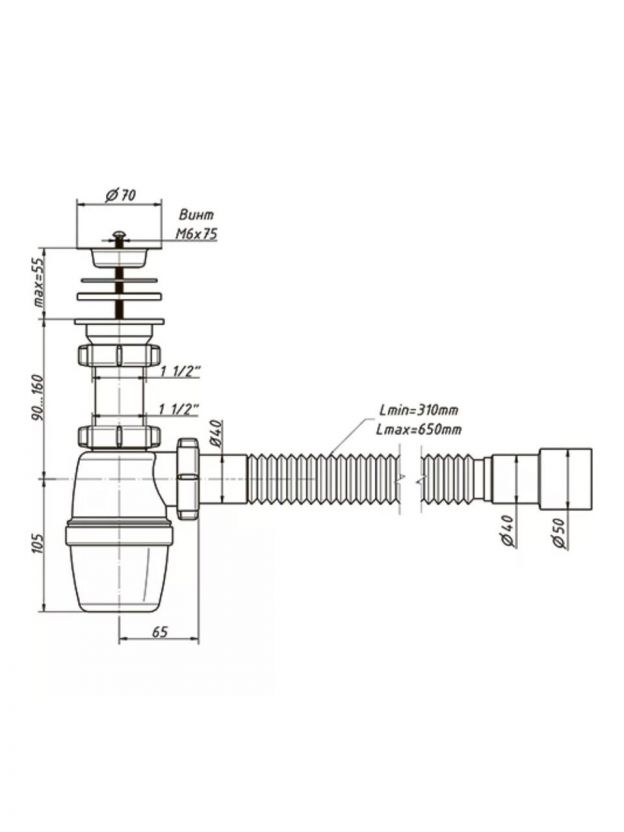 Бутылочный сифон выглядит как бутылка с горизонтальным ответвлением. Для подключения этой конструкции необходимо немного свободного пространства. Вода, которая находится в колбе, предупреждает проникновение канализационных запахов в помещение.