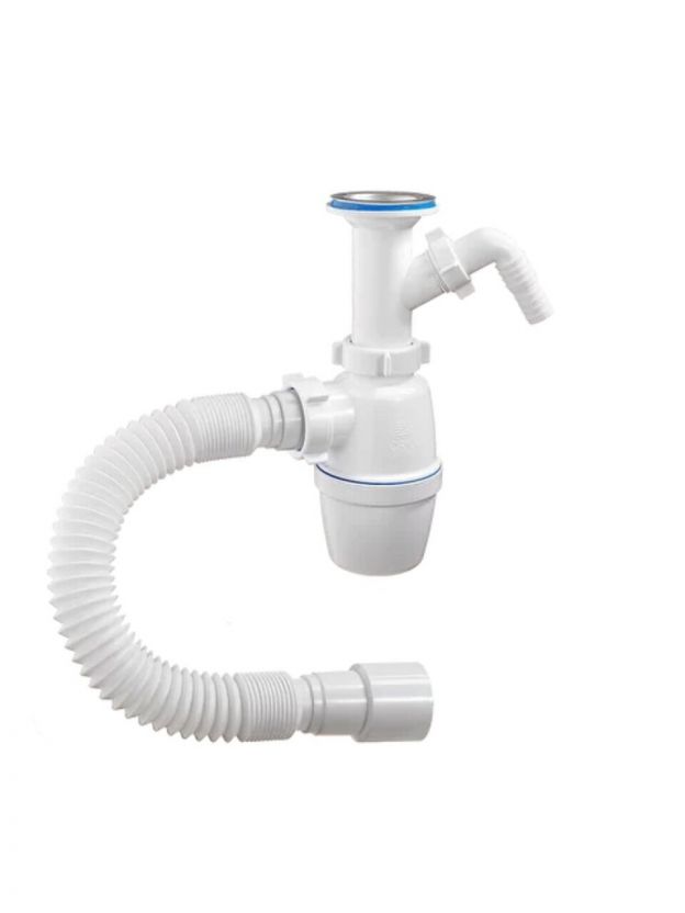 Сифон с большим корпусом и отстойником, литым выпуском и нержавеющей чашкой диаметром 70мм, одним отводом и гибкой трубой 40-40/50 для раковины или мойки.