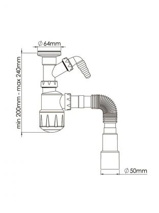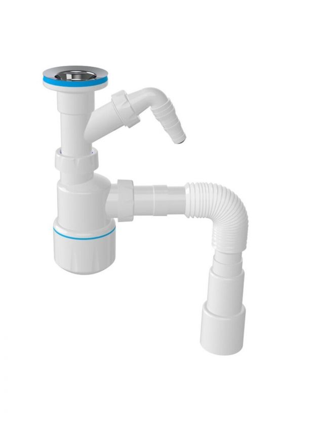 Сифон для мойки, 1 1/4", с выпуском 64 мм, отвод для стиральной машины, с гибкой трубой 40/50, Aquanova, 1056