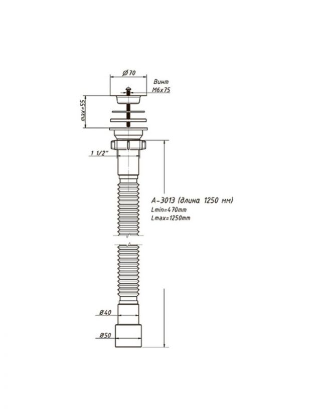 Сифон для мойки, 1250 мм, 1" 1/2х40/50, полипропилен, с выпуском, белый, Orio, А-3013