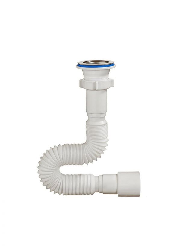 Гофрированный сифон – обладает простой конструкций, его часто используют, если под мойкой мало свободного пространства. Система может принять любую форму, ведь представлена гофрированной трубой, она легко складывается и раскладывается. Это компактный сифон для кухонной мойки.