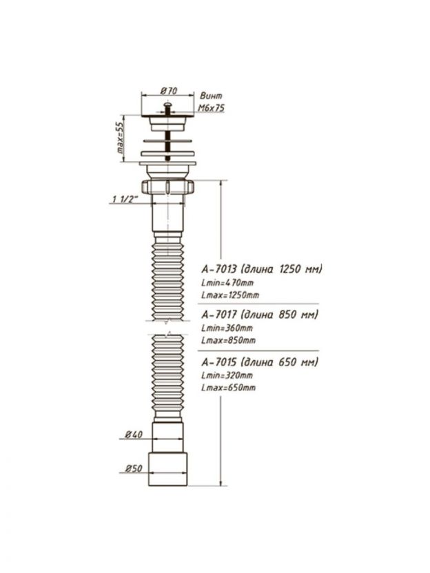 Сифон для мойки, 850 мм, 1" 1/2х40/50, полипропилен, с выпуском, Orio, А-7017