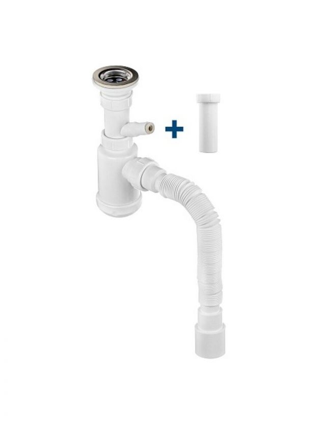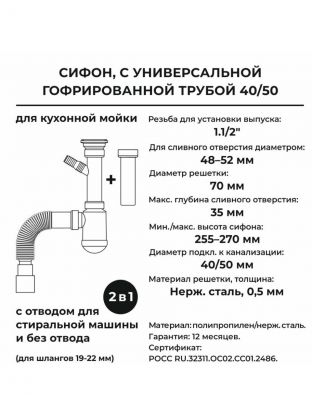 • Комплектация: с гофрированной трубой в комплекте (подходит для подключения сифона к канализационной трубе диаметром 40 или 50 мм).