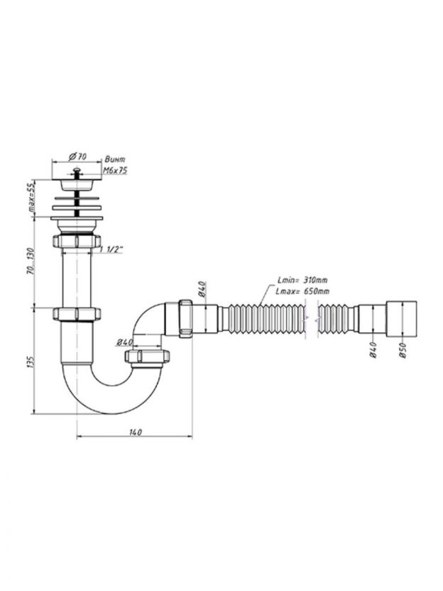 В комплекте идёт полированная нержавеющая чашка диаметром 70 мм. Сифон комплектуется нержавеющим винтом длиной 75 мм, нержавеющей гайкой М6 и уплотнительной прокладкой под нержавеющую чашку. Гибкий отвод позволяет подключить слив сифона к канализации с диаметрами 40 или 50 мм. Конструкция сифона самоочищающаяся.