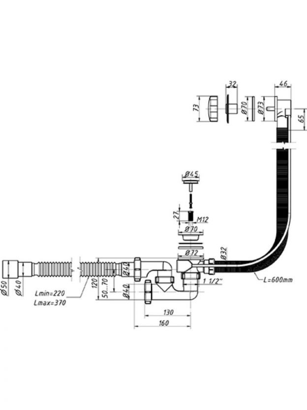 Сифон для ванны, 1" 1/2х40/50, полипропилен, полуавтоматический, Orio, А-28089