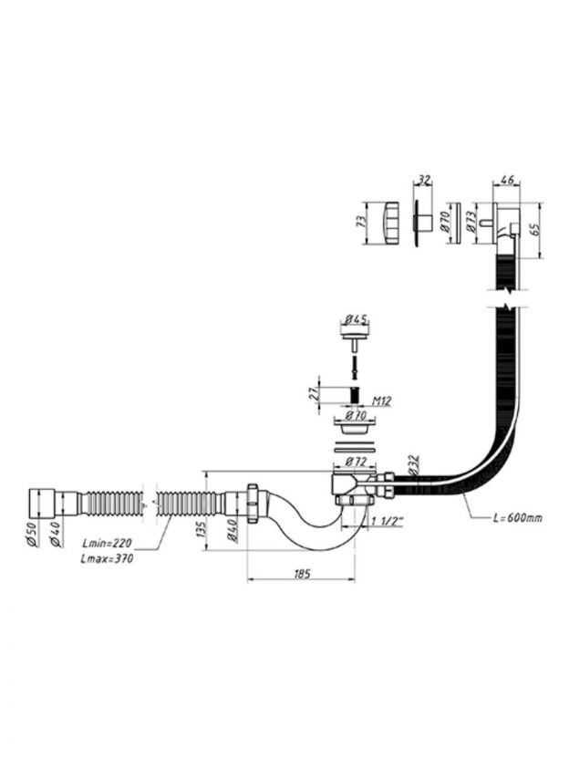 Сифон для ванны, 40х40/50, с выпуском, полуавтомат, Orio, А-24089
