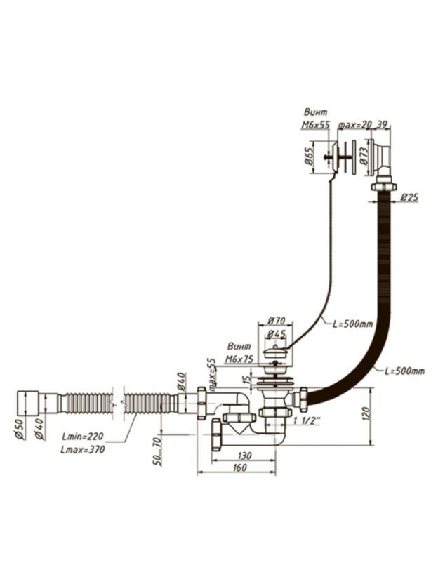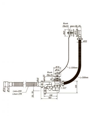 Сифон 1 1/2"х40, с переливом и нержавеющими чашками, для ванн и глубоких душевых поддонов.