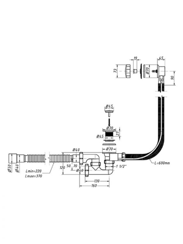 Сифон 1 1/2"х40, с полуавтоматическим сливом (латунь/хром)-переливом (латунь/хром), для ванн и глубоких душевых поддонов. Конструкция сифона позволяет прочищать сифон, не демонтируя его. Отвод в канализацию гибкая труба 40-40/50..