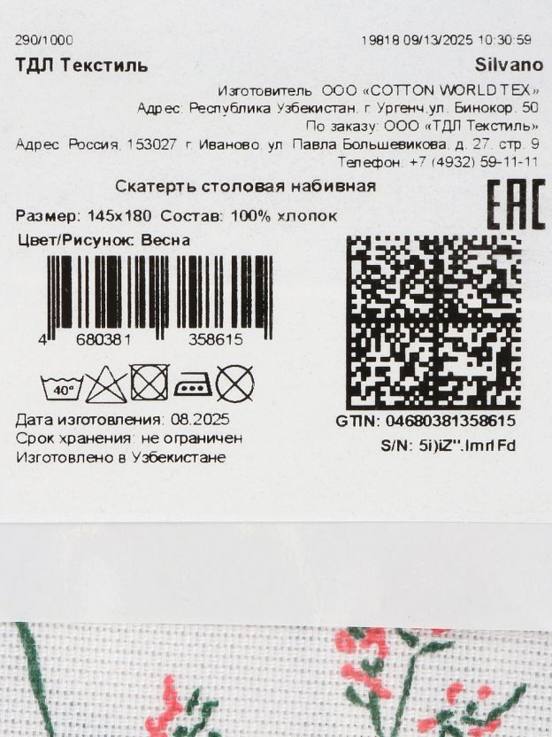 Скатерть Silvano «Весна» 145х180 см из 100% хлопка — выбор для тех, кто ценит натуральные материалы и долговечность. Зеленый цвет и цветочный принт гармонично впишутся в любой интерьер, освежат кухню или гостиную. Если вы ищете, какую скатерть выбрать для ежедневного использования или семейных праздников, обратите внимание на хлопковые модели: они не электризуются, хорошо держат форму и легко стираются.