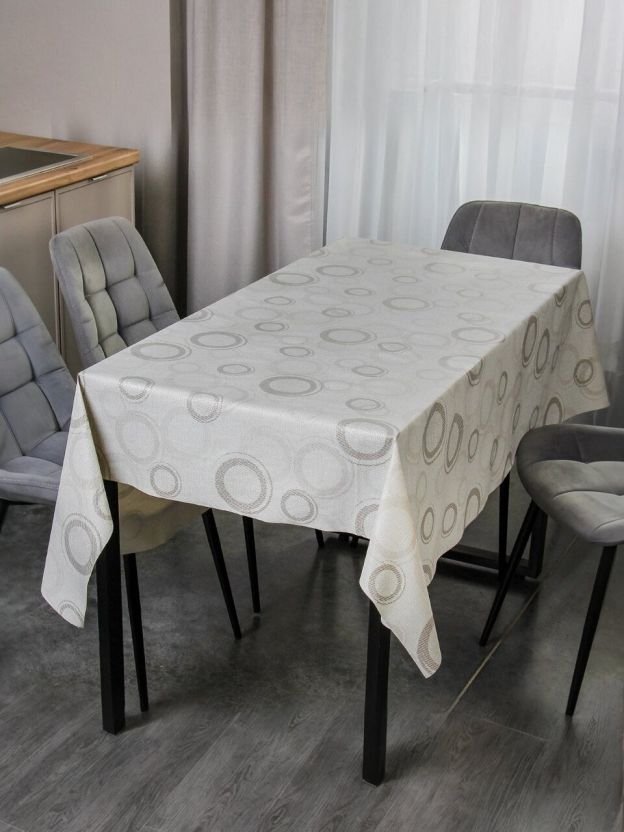 Использование современных технологий производства гарантирует качественную защиту поверхности стола от загрязнений, пятен и механических повреждений. Материал легко очищается влажной салфеткой, не впитывает жидкости и не требует сложного ухода. Скатерть не имеет водоотталкивающей пропитки, однако плотная структура ПВХ надежно защищает мебель от случайных капель и крошек. Серый цвет и абстрактный рисунок создают актуальный образ, который подчеркнет индивидуальность пространства и добавит уюта в дом.