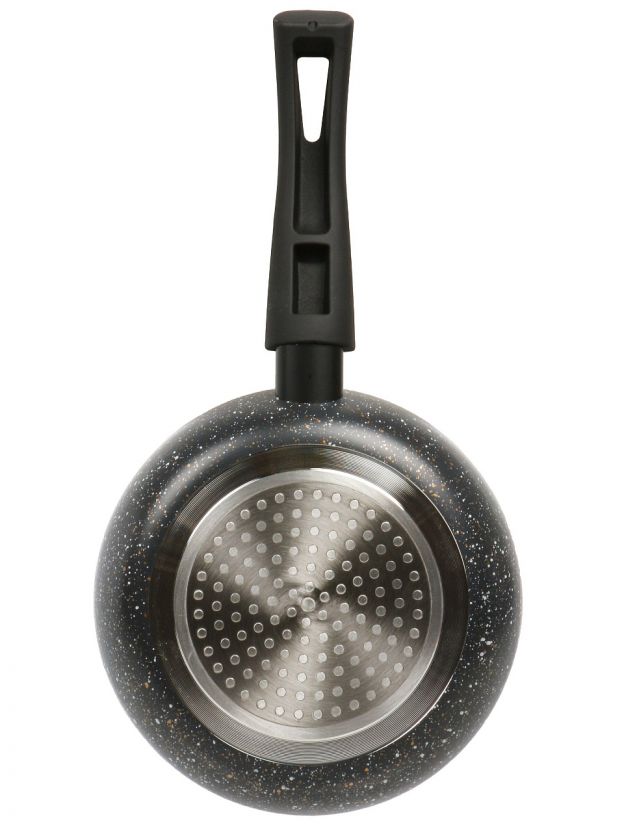 - Оптимальный диаметр 18 см — компактная, выполнена из лёгкого алюминия, быстро нагревается и держит тепло