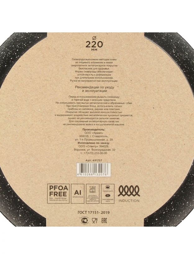 Диаметр сковороды — 22 см, высота борта — 60 мм, толщина стенок — 2,65 мм. Это оптимальные параметры для жарки, тушения и приготовления завтраков.