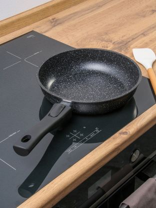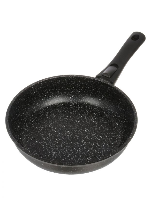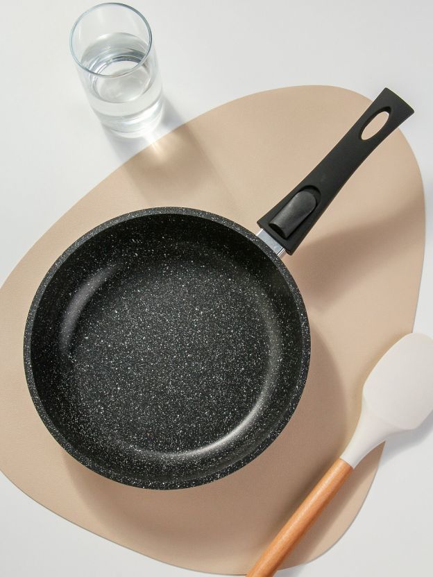 Если вы ищете, какую сковороду выбрать для универсального использования, обратите внимание на глубину борта 60 мм: удобно готовить блюда с соусами, тушить овощи или жарить стейки. Съемная ручка позволяет легко разместить сковороду в духовке или посудомоечной машине, а отсутствие деревянных деталей увеличивает срок службы. В отличие от моделей с классическим тефлоновым покрытием, гранитный слой устойчив к царапинам и не боится металлических лопаток.