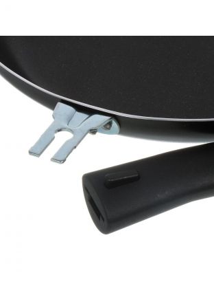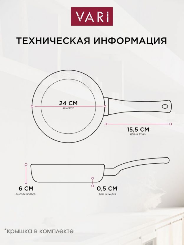 Диаметр сковороды — 24 см, диаметр дна — 18,8 см, высота борта — 60 мм; это позволяет готовить блюда для всей семьи или компании.