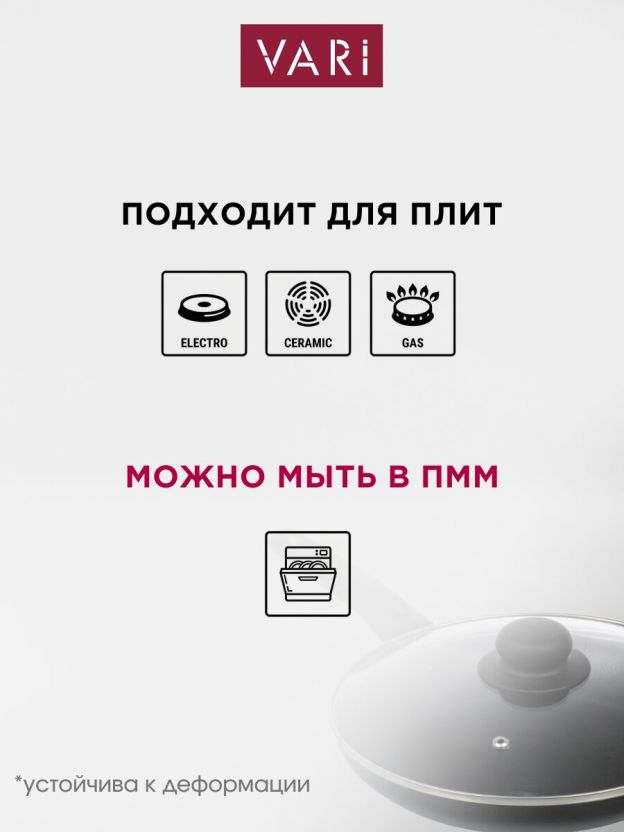 В отличие от аналогов без крышки, эта сковорода комплектуется удобной крышкой, что помогает сохранить сочность блюд и ускорить приготовление. Если вы ищете, какая сковорода лучше для тушения и жарки, обратите внимание на толщину дна — у модели Vari 5 мм, что обеспечивает равномерное распределение тепла и предотвращает деформацию. Сковорода не предназначена для индукционных плит, но отлично подходит для большинства стандартных типов плит. Как использовать сковороду на даче? Просто берите её с собой: она лёгкая, прочная и универсальная.
