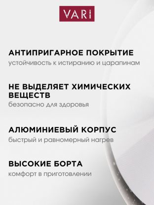 Выбирайте сковороду Vari 24 см с антипригарным покрытием по лучшей цене — это выгодное вложение в ежедневный комфорт и качественную домашнюю еду. Закажите прямо сейчас, чтобы получить быстрый старт кулинарных экспериментов с гарантией производителя 12 месяцев.