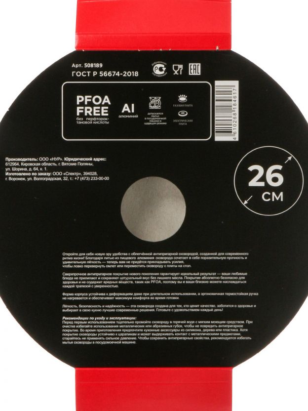 Диаметр — 26 см, толщина дна — 5,2 мм, что обеспечивает равномерный нагрев и долговечность.