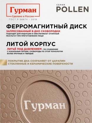 Часто спрашивают: «Как выбрать сковороду для индукционной плиты?» — данная модель полностью совместима с индукцией, а также газовыми, электрическими и стеклокерамическими плитами. В отличие от аналогов с тонким дном, сковорода Гурман Pollen устойчива к деформациям и сохраняет свои свойства даже при интенсивной эксплуатации. Можно мыть в посудомоечной машине — экономия времени и сил. Крышка и съемная ручка не предусмотрены, что увеличивает надежность конструкции и снижает риск поломок.