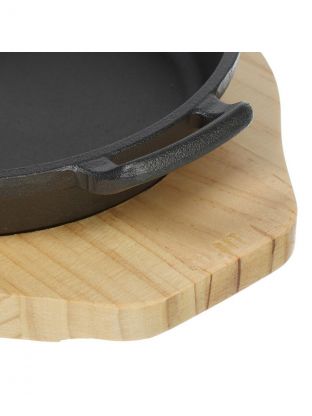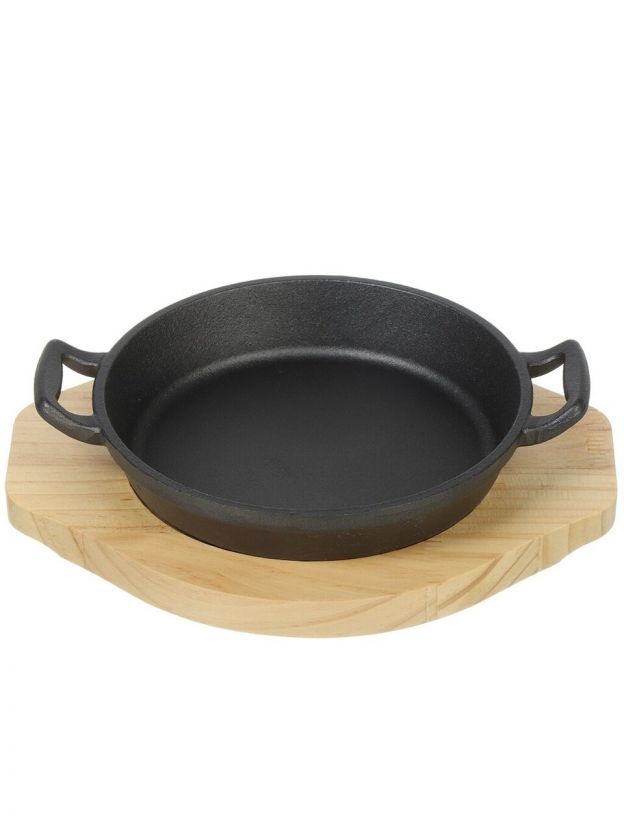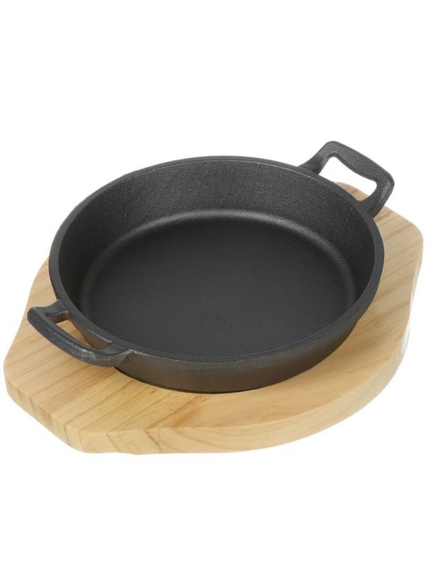 Чугунная сковорода 18х3,5 см с бамбуковой подставкой — долговечное решение для жарки мяса, рыбы, овощей дома и на даче. Прочная, универсальная, выгодная цена.